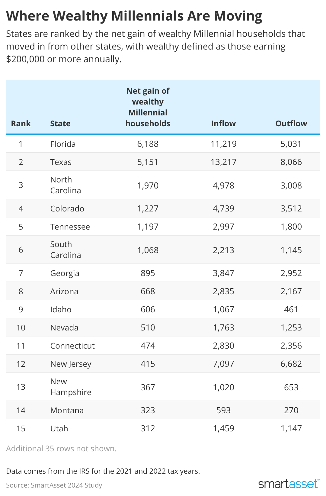 - Florida and Texas gained the most wealthy millennial households. When looking at the inflow and outflow of wealthy millennials, Florida had the highest net immigration of high earners in this age group with 6,188 households. Texas ranked second with a net gain of 5,151 households. Trailing behind in third was North Carolina with a net of 1,970 households moved in.
