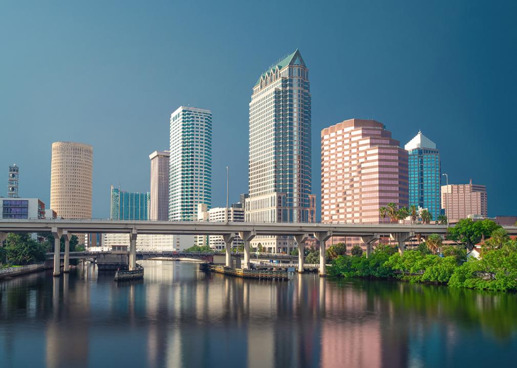 A panoramic view of downtown Tampa, Florida including the Hillsborough river.