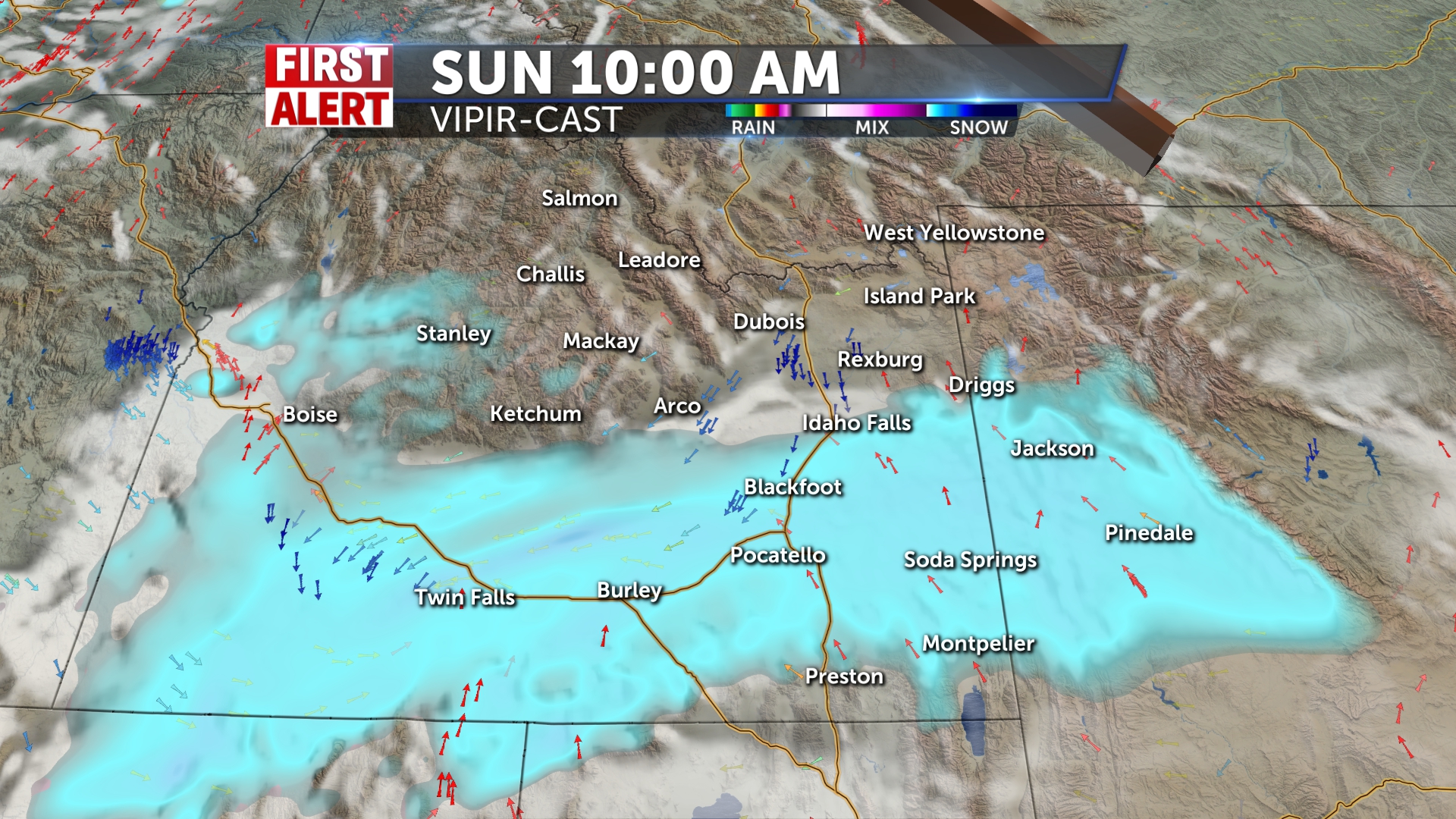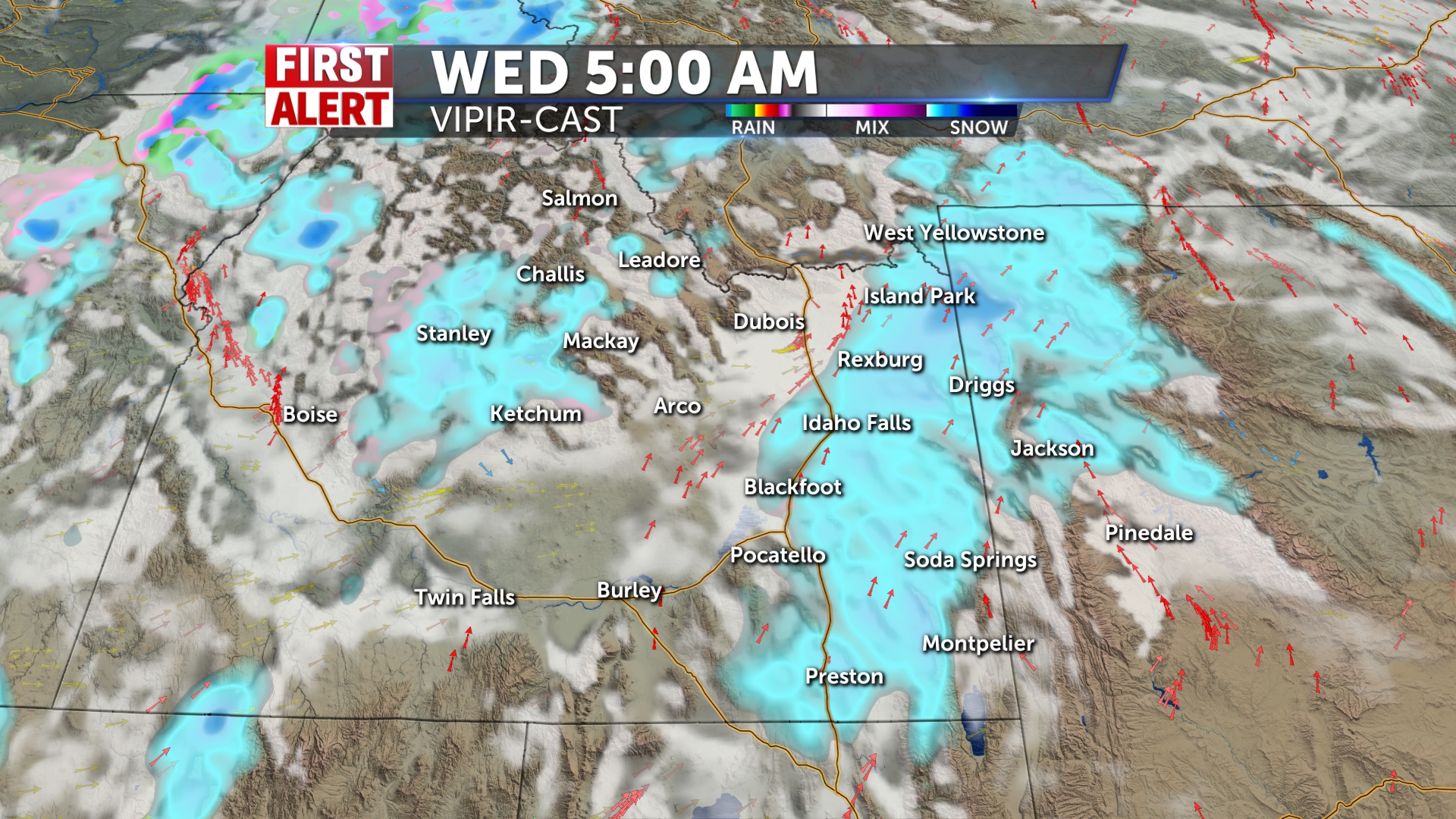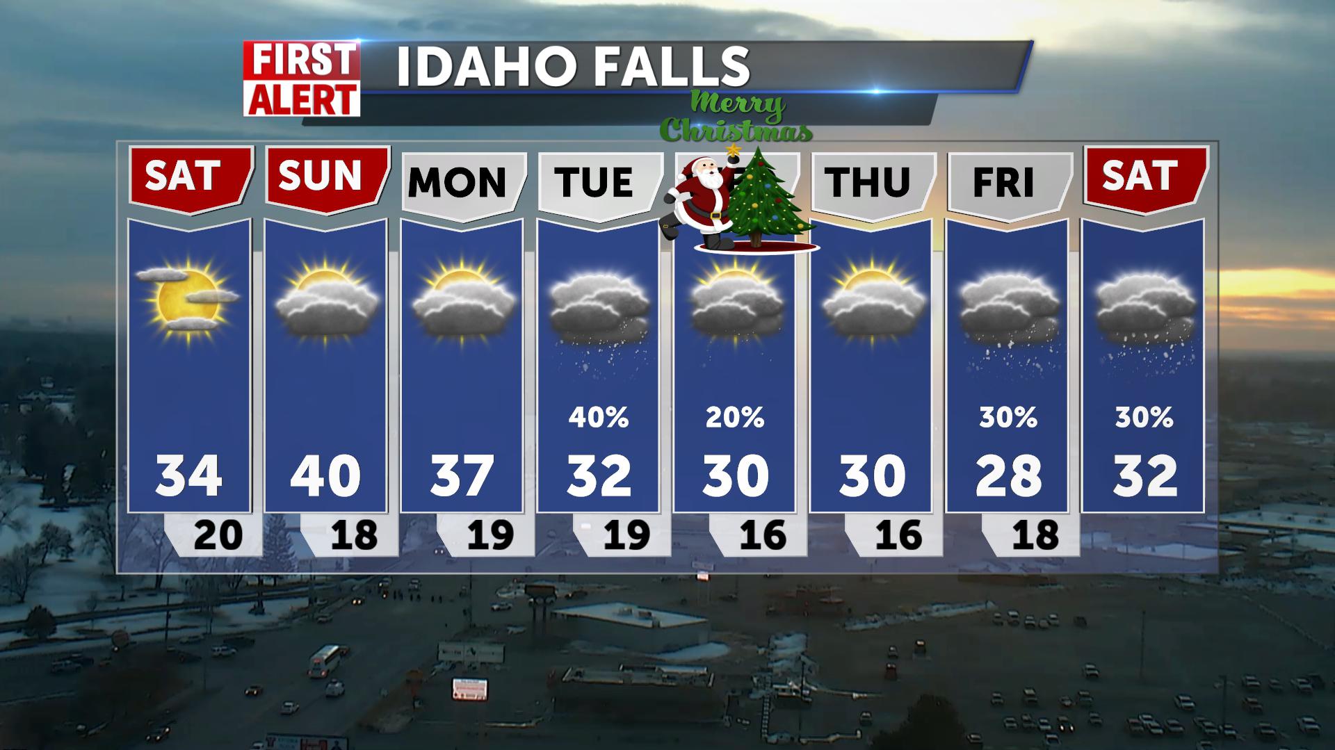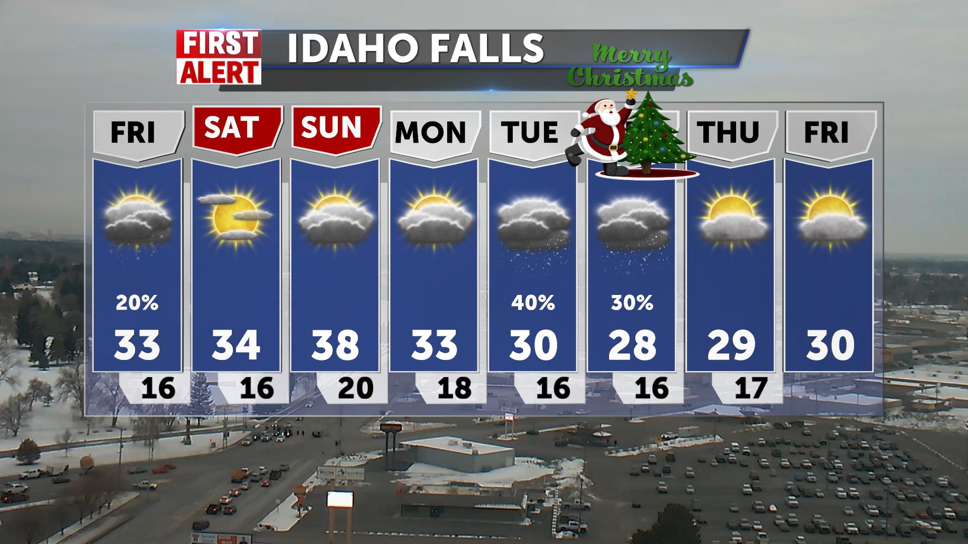 Snow chances for Christmas Eve from Jackson to IF @50% with 1-3″ possible for the Snake River Plain. Above average temps with some windy conditions…