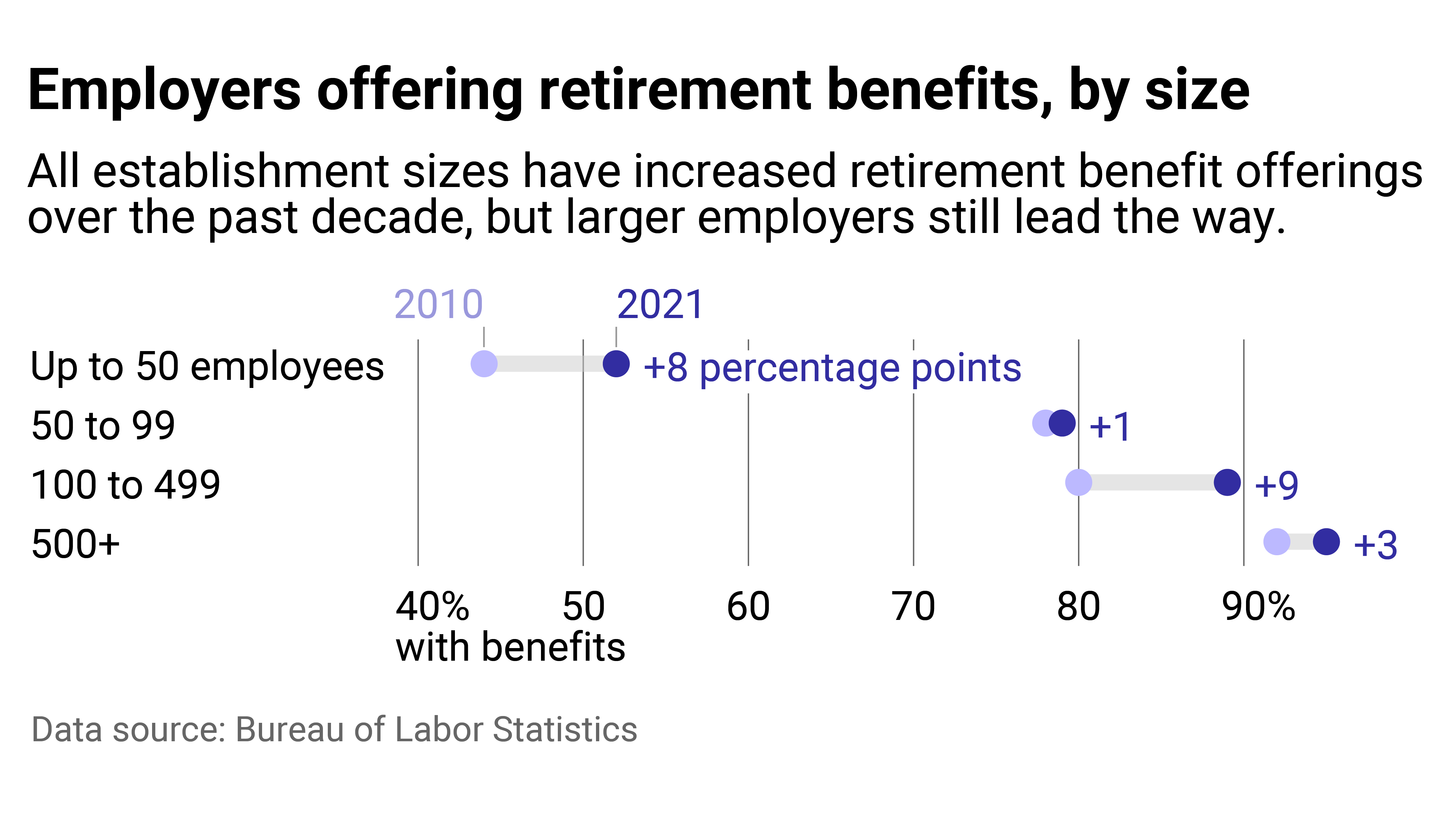 A range plot showing the growth in percentage of employers of various sizes offering retirement benefits.