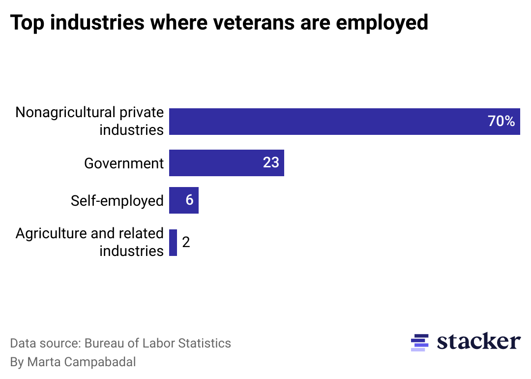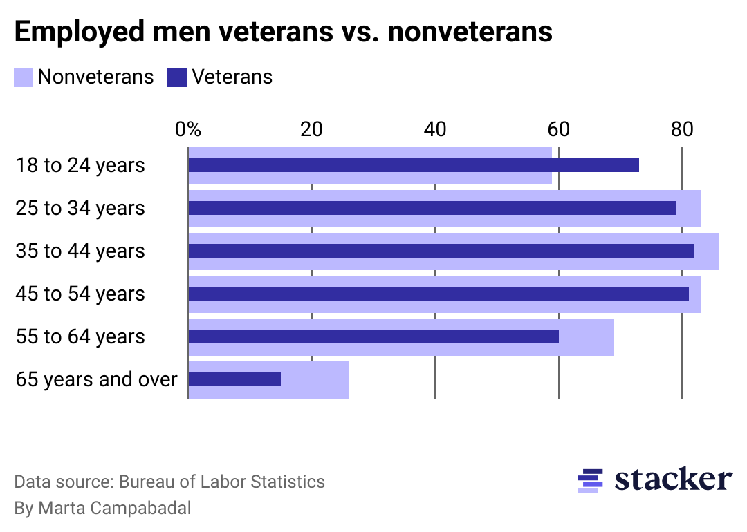 Once a veteran leaves the armed forces and reenters the labor force, how do their job prospects stack up to those of their nonveteran counterparts? To understand how veterans’ employment compares to the rest of the population, Stacker cited data from the BLS to create several visualizations.