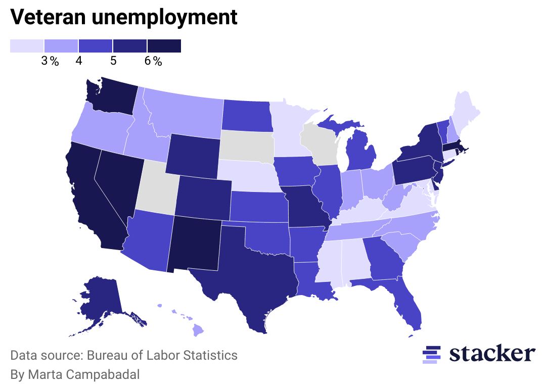 Unemployment map with percentage of unemployed veterans from the labor force per U.S. state