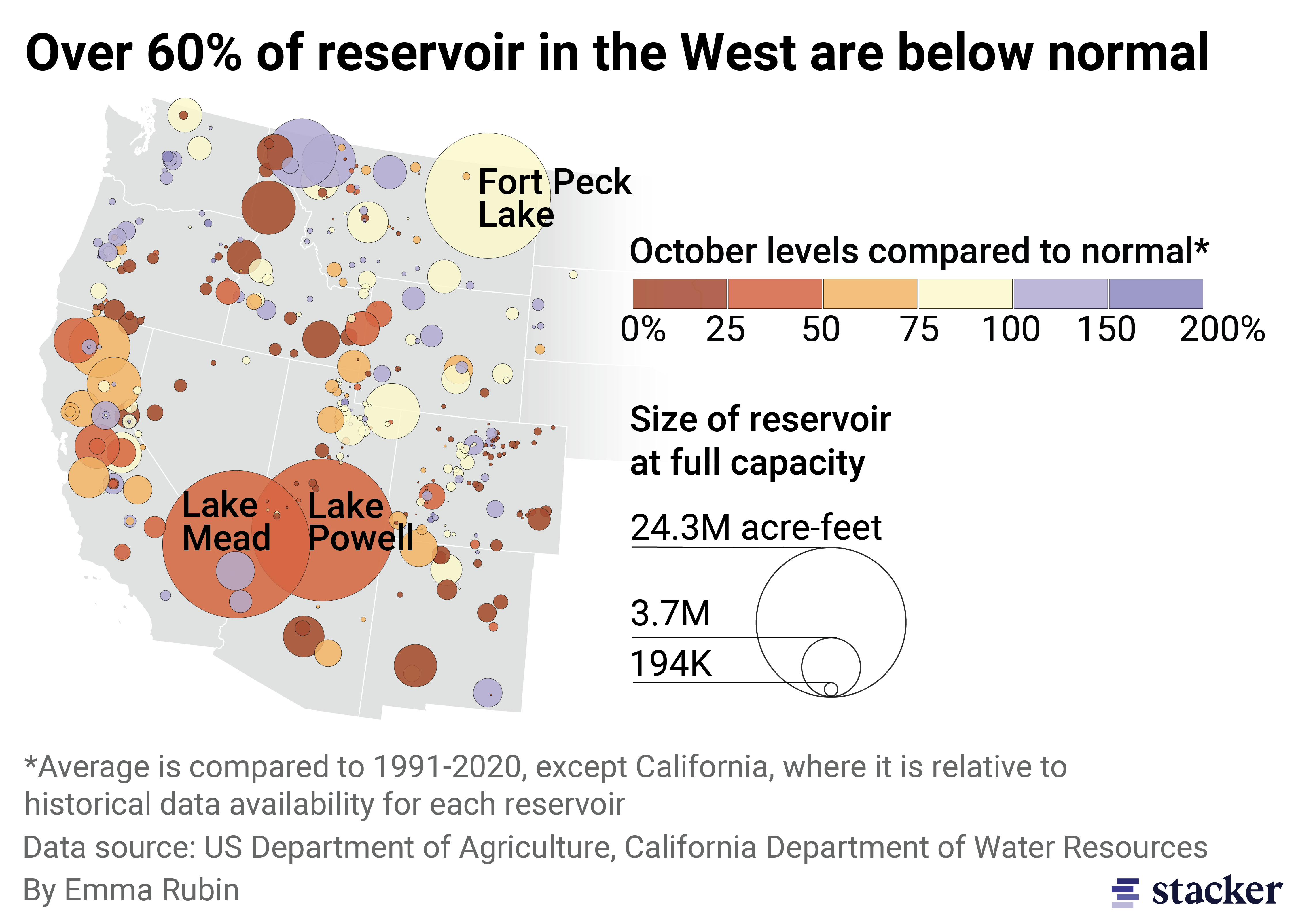 Bubble map highlighting Lake Mead, Lake Powell as well as many other Western reservoirs reaching low-levels as of October 2022
