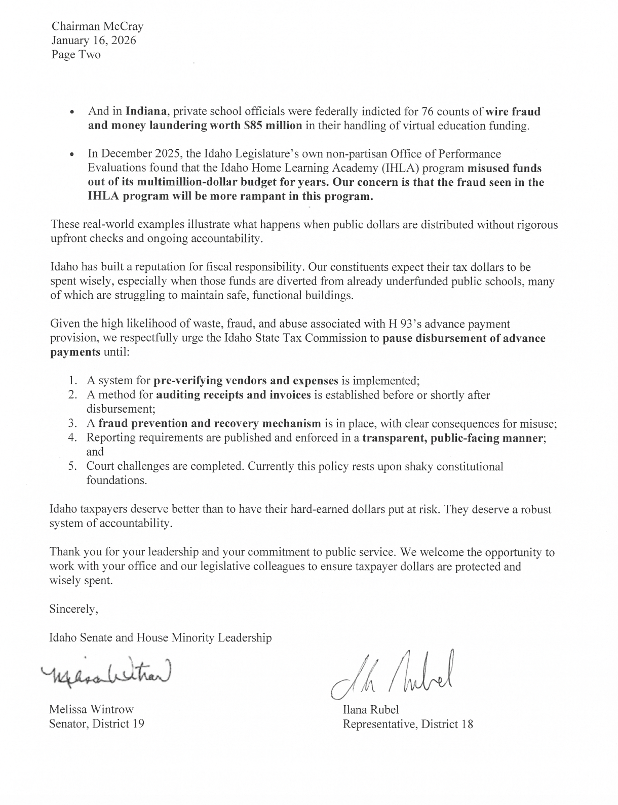 "We're worried that the Idaho Tax Commission has not built in enough oversight (in) how that money is spent. We know of no auditor who's going to go check to make sure that the money is spent properly. No clawback provisions to make sure that the money, if it's misspent, fraudulently wasted, there's no clawback provision that will allow the state Tax Commission to get that money back, or at least nothing that's enforceable," District 29 Senator James Ruchti said, who helped draft the letter to the Idaho Tax Commission Chairman Jeff McCray.