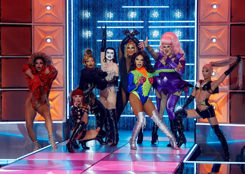 From left, Shannel, Jorgeous, Angeria Paris VanMicheals, Gottmik, Roxxxy Andrews, Vanessa Vanjie, Nina West and Plastique Tiara pose in RuPaul’s Drag Race All Stars, episode 1, season 9.