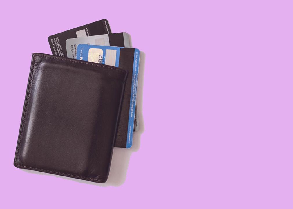Overhead view of wallet with multiple credit cards spilling out against a pink backdrop.