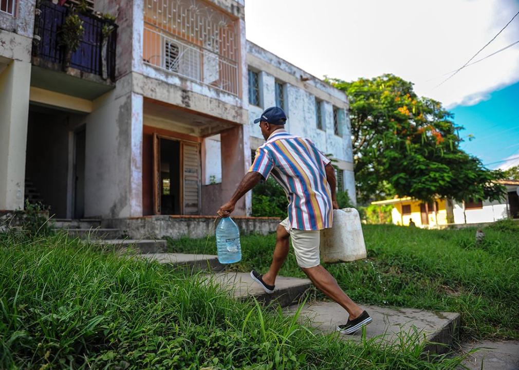A man walks up concrete steps carrying plastic jugs of water in the Consolacion del Sur neighborhood in the Pinar del Rio province, Cuba.
